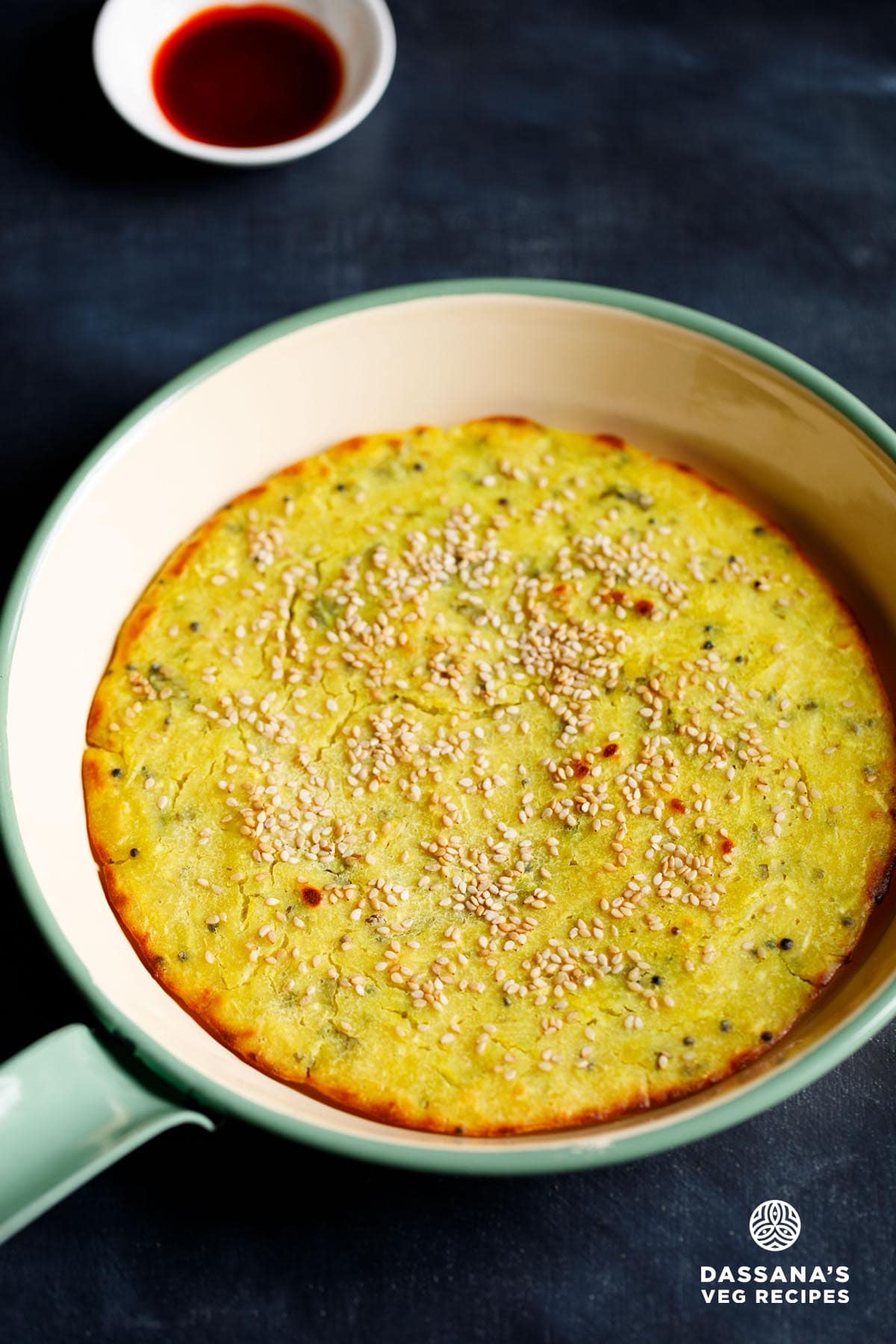 Once hot, spread 1 to 2 teaspoons oil in the pan and up into the sides. The more oil you use, the more crisp the handvo will get on the bottom.