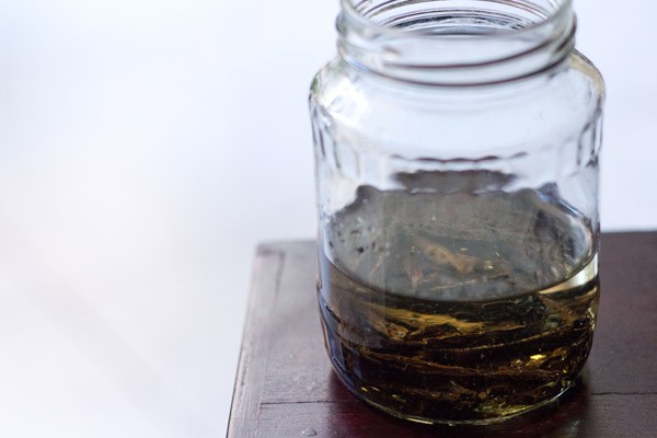 5. Once a week, shake the jar to ensure you’re steeping the entire bean. Allow the vanilla beans to steep in the liquor for at least a month so that the alcohol extracts the flavors from the vanilla beans.