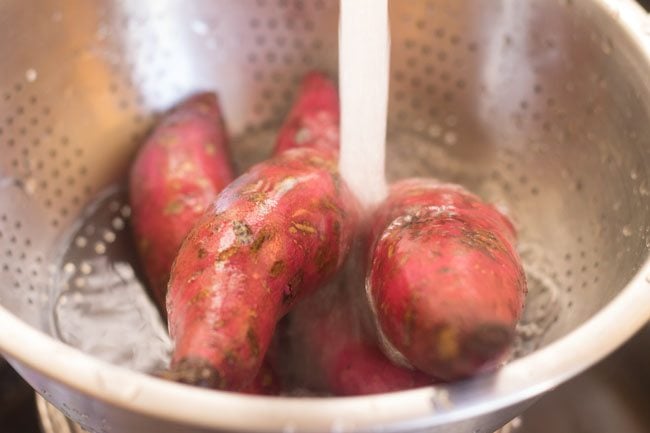 1. Rinse 4 medium-sized sweet potatoes (shakarkandi) well in water.